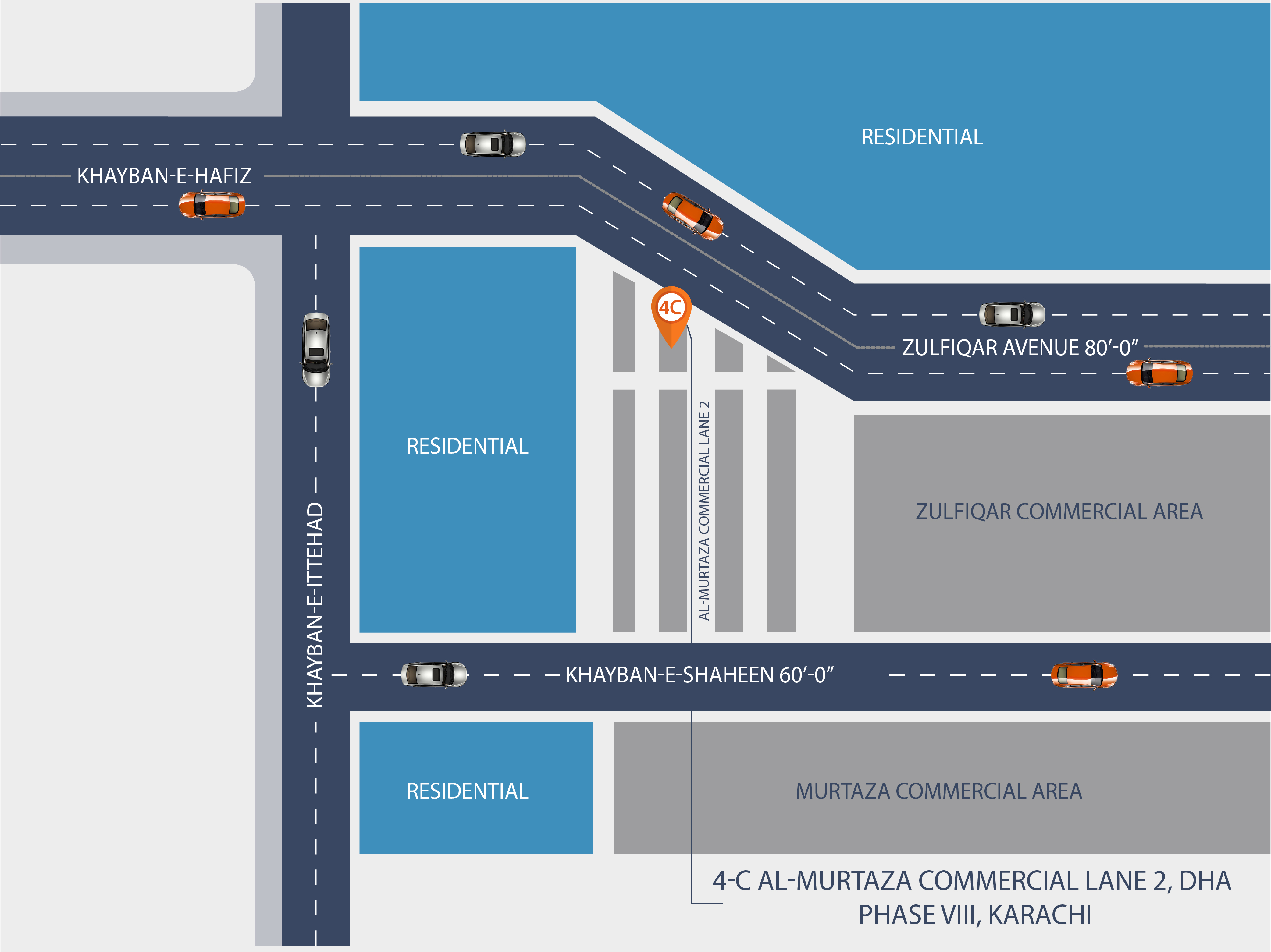 Location is at 4-C, Al Murtaza Commercial Lane.2, DHA Phase VIII Karachi(Right Next to main Zulfiqar Avenue which is a 80 feet wide 2 way main road and has the major traffic inflow & outflow of DHA Phase 8, let it be residents, or related to schools, colleges, restaurants, mall, cinema or visitors). It serves as the main artery to enter and exit Dha Phase-VIII, and its importance will keep increasing with time due to new developments and businesses in this zone.